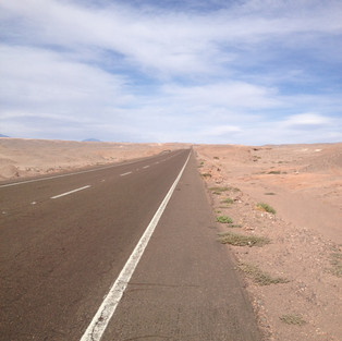 Con mucho animo y resistencia poco a poco consigo a llegar sin pausa a la cima goteando de sudor y terminando mi agua. Luego de recuperarme atravieso el túnel que está envuelto de aire fresco por la sombra permanente de las entrañas de las rocas. Poco a poco el puntito de luz se hace más grande hasta que por fin salgo, un poco cegado por la luz de día, y no recordando bien la explicación sigo las huellas de otras bicicletas y motos que han pasados y que se pierden como serpientes en un caudal seco de una arroyo que aparece solo con las lluvias. Sigo y sigo en una bajada relajadora, pero me doy cuenta que la dirección no es esa que quería y me encuentro en el medio del desierto. Solo a lo lejos veos unos puntitos moviéndose. Son los carros que pasan por la carretera San Pedro-Calama. A este punto decido llegar hasta allá para luego regresar por el camino asfaltado. Parece cerca pero no lo es y la arena dilata aun mas este espacio. Después de 2 horas llego y veo en el piso los kilómetros que faltan al pueblo: 20km. Uuuuuuf, habré hecho otros 20 por la arena y ahora me faltan otros 20 en buena parte en subida. Echándole gana llego a la parte más alta de la cordillera de sal donde los tours aprecian el atardecer y en una bajada larga entre las colinas rojas talladas por la lluvia de cientos de siglos llego al pueblo.